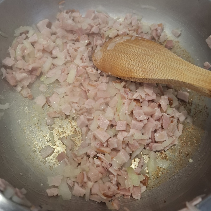 Fleckerl in gesalzenem Wasser bissfest kochen, Zwiebel und Schinken in einer Pfanne etwas anrösten. Mehl mit Butter in einem Topf anschwitzen, mit Suppe aufgießen und aufkochen lassen – gut rühren, die Einmach wird dickcremig und brennt leicht an. Alles zur Seite stellen und etwas überkühlen lassen.