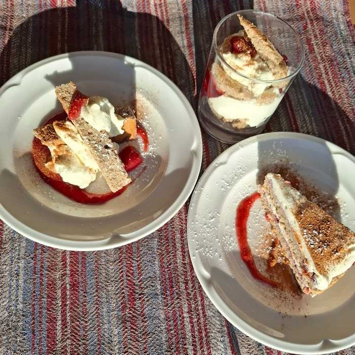 – Als schnelle Nachspeise den Boden noch warm in Stücke schneiden und gleich mit der Creme und den Preiselbeeren servieren – Zimt nicht vergessen!